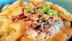 糯米饭做法简单,几乎每一个社区的每一家早餐店里都有,各家区别只是在生汤肉的味道、油条碎的软硬程度和其他佐料的配置上。早上4点,早餐店老板们就开门准备营业了,掏干净糯米,平铺在纱布上铺进蒸笼,白气袅袅上升,大锅里沸水滚滚“咕咚咕咚”,一波一波冲撞着笼体,属于糯米的清香开始弥漫在整条街上,伴着温暖的晨阳,迎接每一个上班上学的人。盛一勺糯米在碗底,再铺上一层双泡后炸的酥脆再碾碎的油条碎,撒一勺味道鲜浓的生汤肉,让它润过每一粒米饭,再放上虾皮,萝卜条,香肠粒,让一碗糯米饭打开休息了一晚上的胃吧。