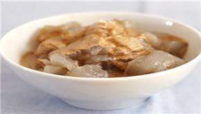 烟台焖子是山东烟台著名的传统小吃,用粗制地瓜淀粉做原料,将淀粉加水加热打冻,将冻切成小块,用锅煎到外边成焦状颜色由白变透明,并佐以虾油、芝麻酱、蒜汁等调料上桌即可。一勺蒜汁一勺海边人独有调味品虾油混杂在一起,香浓的味道和爽滑的口感瞬间四溢。