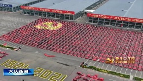 为庆祝建党百年,我市800余名红色、黄色车辆车主齐聚大庆赛车小镇,经过两个多小时的统筹调度,一面由汽车拼成的特殊巨幅党旗徐徐“展开”。、