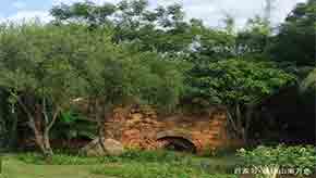 一座古怪的小建筑物被绿树掩映在湛江市开发区南国公园书吧旁的斜坡上。这座三、三米高,由旧的红砖砌成,拱形低矮,似乎供人或物进出。