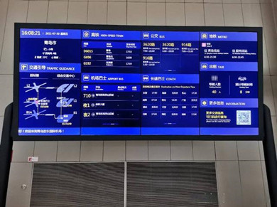 “出租车等候人数12人,预计等候时间5分钟;地铁8号线五四广场方向,运营时间为8点至21:30;开放黄岛莫泰酒店的机场巴士,最近一趟11点发车,剩余车票15张……”乘客可通过屏幕显示的交通方式及换乘诱导信息,简单快速地了解到选择哪种交通方式最为方便、快捷。