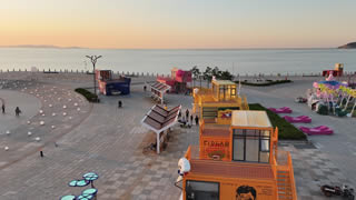 网红商业区以创意集装箱为载体,将蓝鲸与云朵作为主体IP形象, 提供 “日戏海滩,晚观落日”的行浸式商业体验,同时融合城市直播间、沉浸式戏剧演艺、艺术展览、文创市集、亲子娱乐等多种业态,打造成为具有芝罘滨海特色的文商娱综合体。