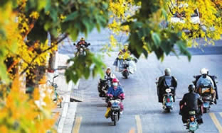 午后,67岁的张旭牵着老伴的手,伴着冬日暖阳,在街头遛弯。阳光,穿过层层叠叠的树叶洒到路面上,变成了淡淡的、圆圆的光晕,轻轻摇曳。路上,还偶有堆堆簇簇金黄的落叶,风乍起时,叶子翩翩飞舞,行人穿梭其间。看着此景,老两口新生感慨:太原一年四季有绿、三季有花,旖旎风光美如画,这是生态环境建设的硕果,也是大伙乐享的快乐幸福日子。